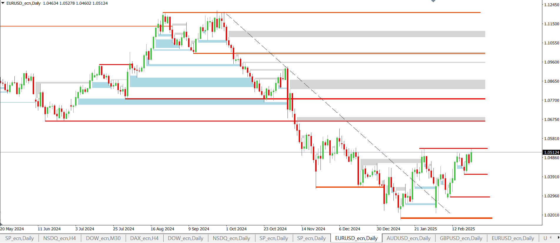 Aktuálně se cena přiblížila k rezistenci, která je na 1.0530. Pokud by došlo k jejímu překonání, volný prostor je prakticky až k 1.0660. Mezinárodní politická situace a hrozba tarifů však jsou pro eurodolar spíše medvědí. Pokud by eurodolar prorazil support na 1.0400, pak by byla volná cesta k dalšímu poklesu k 1.0280. Silný support je na low 1.017, které se vytvořilo 13. 1. 2025.