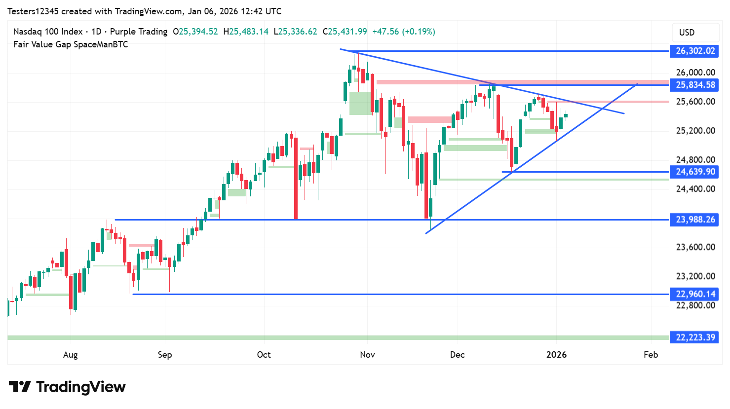 NASDAQ je poněkud pozadu za indexem Dow Jones. Index byl v závěru loňského roku pod silným tlakem v důsledku obav z nadhodnocení akcií, které se vezou na vlně umělé inteligence. Z pohledu technické analýzy lze říct, že cena se pohybuje v konsolidaci uvnitř trojúhelníkové formace, která se vytvořila v rostoucím trendu.