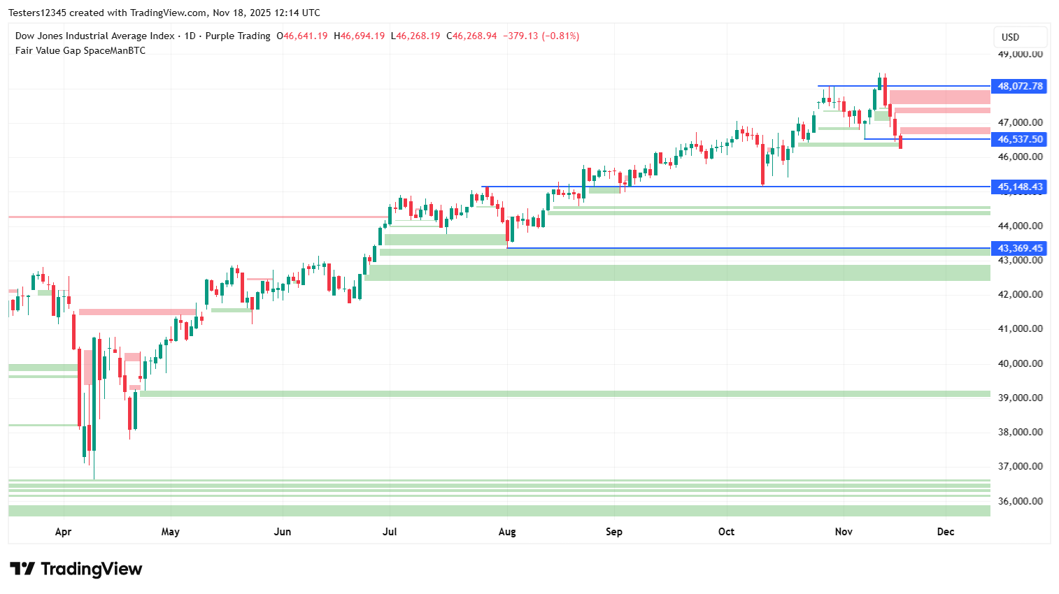 Na indexu Dow Jones vzniklo v minulém týdnu nové historické maximum, které ale bylo vzápětí negováno silnou medvědí svíčkou typu engulf. Při následném poklesu cena prorazila support, který je na hodnotě 46 537 USD. Pokud denní svíčka uzavře pod touto hodnotou, pak by byla volná cesta k poklesu k hodnotě 45 148 USD.