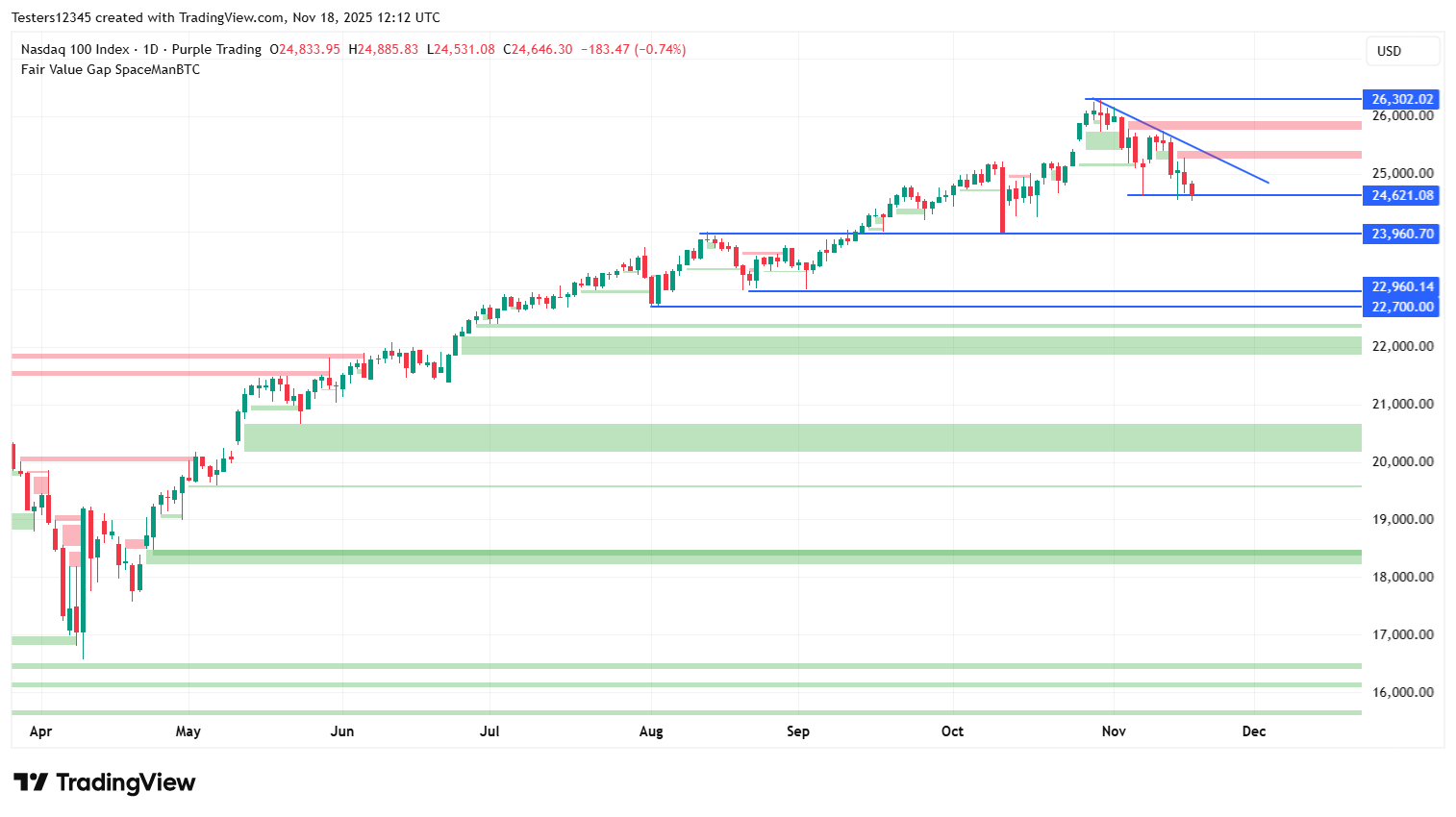 Korekce probíhá rovněž na indexu NASDAQ. Cena aktuálně retestuje swingové low, které je na hodnotě 24 621 USD. Pokud by došlo k situaci, kdy by denní svíčka uzavřela pod touto hodnotou, pak by cena mohla klesnout k dalšímu supportu, který je na hodnotě 23 960 USD.