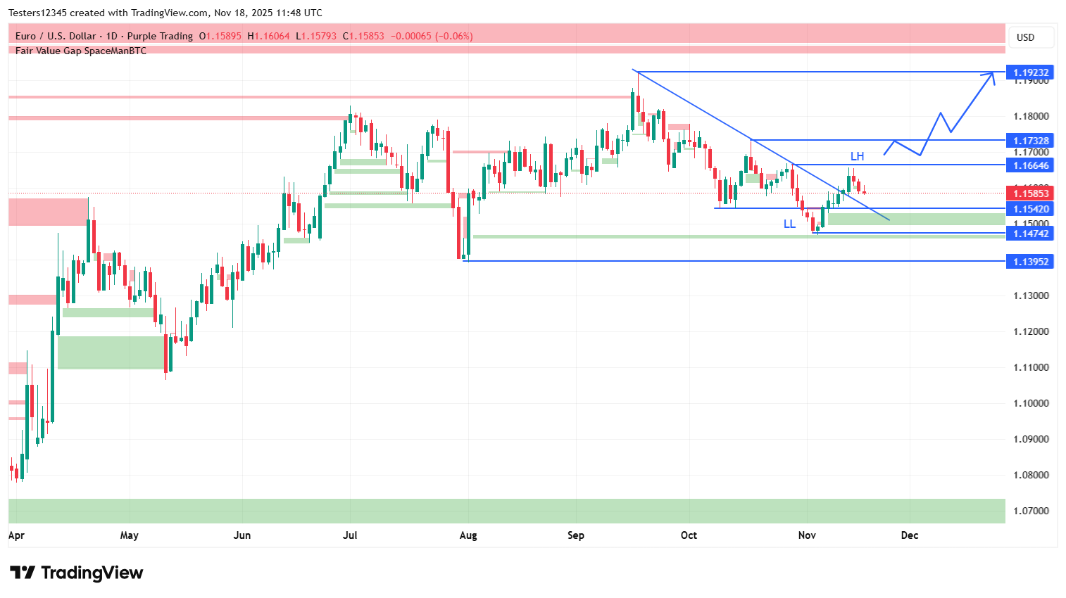 Díky breaku trendové linie máme protichůdné signály, takže celkově se aktuální setup zdá být nejasný, možná s mírnou převahou pro pokles ceny, při kterém by mohlo dojít k vyplnění býčího Fair Value Gapu, jehož spodní hrana je na ceně 1.1500.