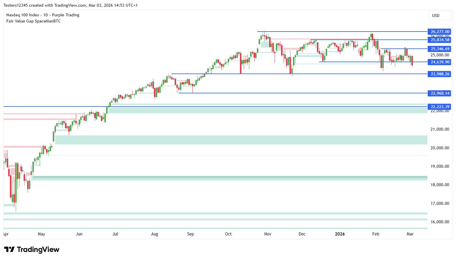 Index Nasdaq-100 reaguje na konflikt v Íránu nepřímo, protože geopolitická eskalace zvyšuje averzi k riziku. Valuace mnoha technologických firem jsou postaveny na dlouhodobých projekcích cash flow a investoři mají tendenci v obdobích nejistoty tyto pozice redukovat.