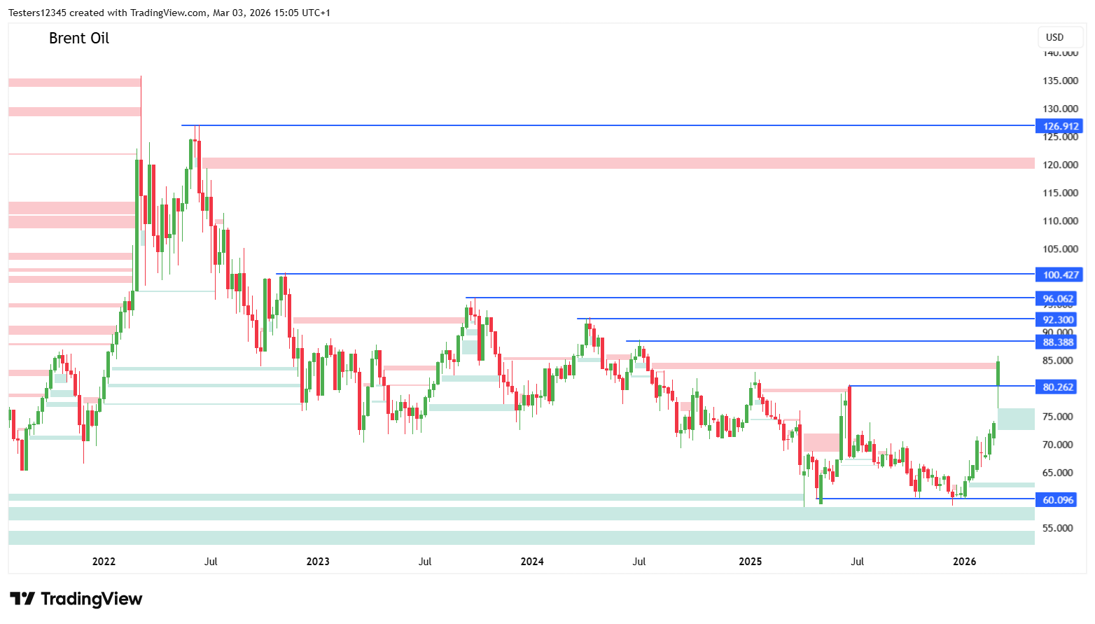 Tradeři by měli myslet na to, že jakmile dojde k deeskalaci napětí, ropa může začít prudce oslabovat. Je proto potřeba pečlivě sledovat další vývoj.