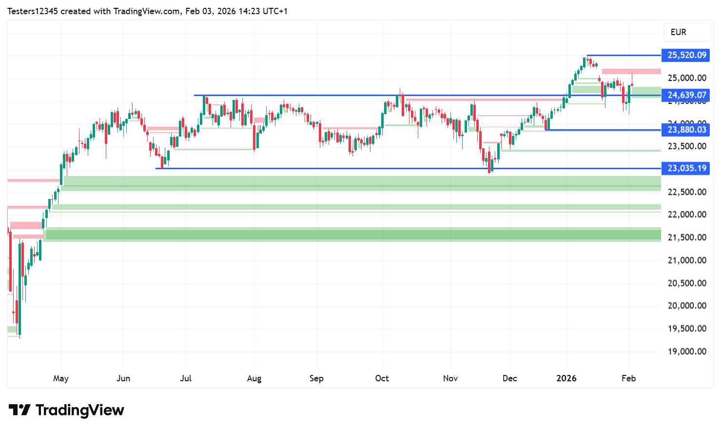 DAX se pohybuje nad oblastí 24 639-24 750 eur, což je významný support. Cena tuto oblast sice prorazila, ale vrátila se opět nad tuto zónu, takže zde vznikl falešný break, a cena by proto mohla mít tendenci pokračovat v růstu. V krátkodobém horizontu jednoho nebo dvou týdnů by index mohl otestovat předchozí historické maximum na 25 520 eur.