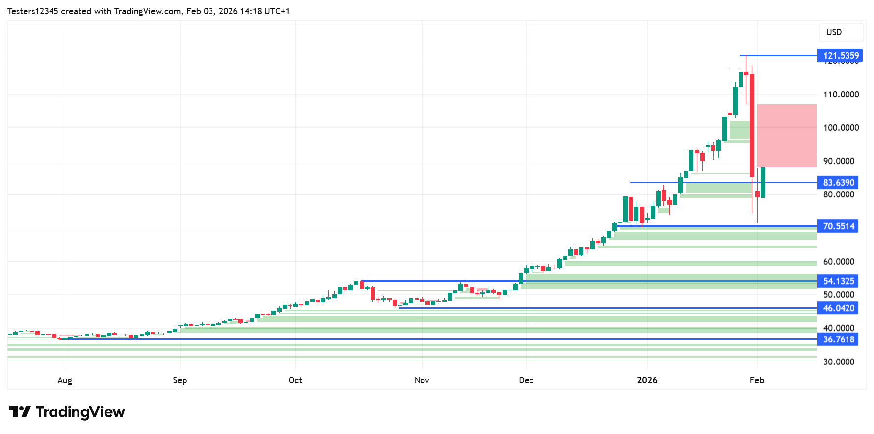 Stříbro v minulém týdnu lámalo rekordy. Nejprve překonalo hodnotu 120 USD za unci, aby se pak v pátek doslova zřítilo, přičemž propad dosahoval v jednu chvíli více než 35 %. V pondělí pokles pokračoval až téměř k hranici supportu u 70 USD, nicméně poté se cena otočila. Býci zkrátka nechtějí dát svoji kůži zadarmo.
