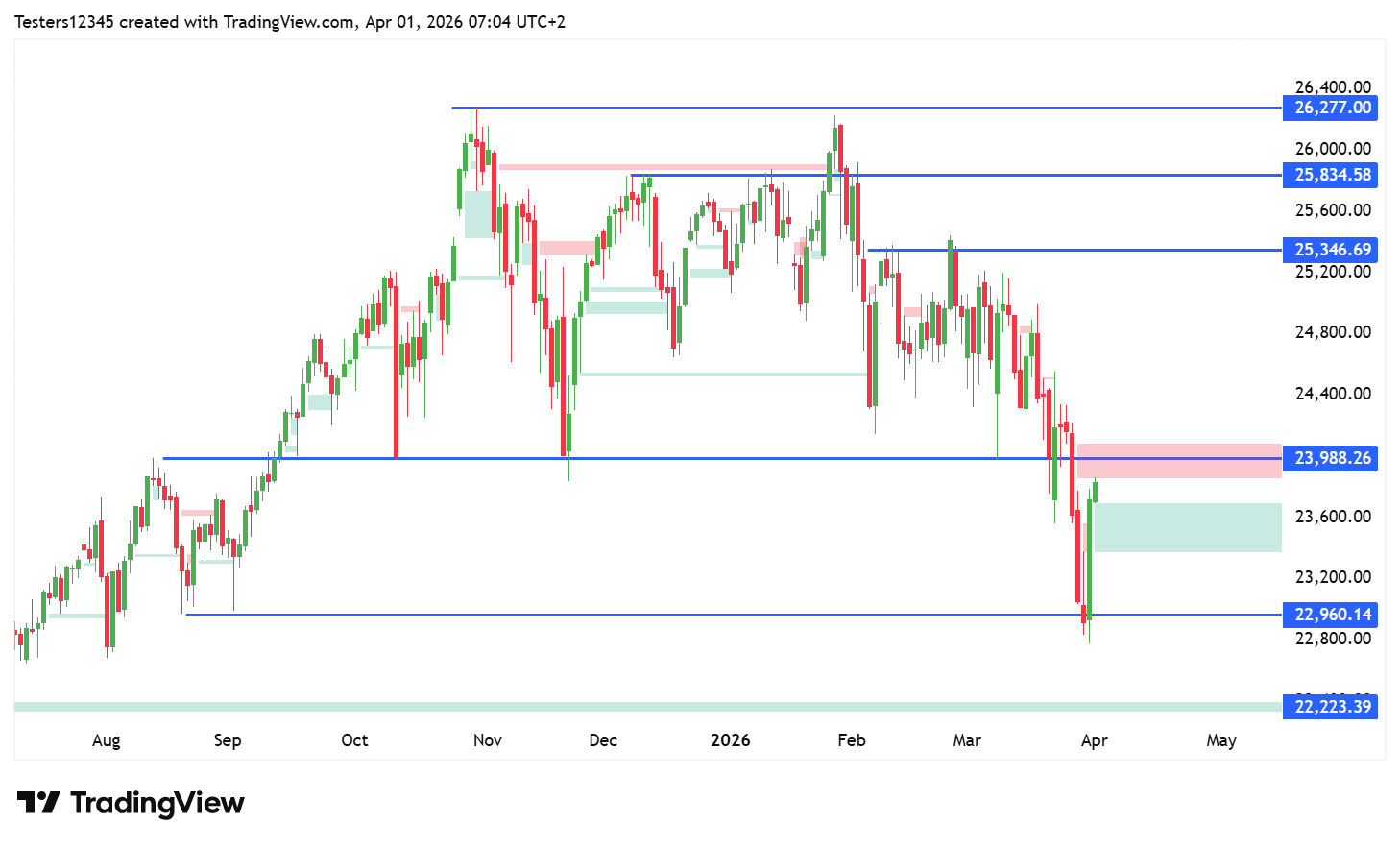 Na indexu Nasdaq-100 došlo k retestu supportu na hodnotě 22 960 bodů, což je nejnižší hodnota od srpna 2025. Na této hodnotě došlo k silnému odrazu směrem nahoru. Tento býčí pohyb byl dán další zprávou o možném ukončení konfliktu v Íránu. Íránský prezident totiž řekl, že země má vůli ukončit tento konflikt. Trump také oznámil, že Amerika opustí Írán do dvou nebo tří týdnů. Jenže různé výroky na téma blížícího se konce této války v minulém měsíci zazněly několikrát, ale na bojišti se nic nezměnilo. Tyto výroky je potřeba chápat jako součást taktiky.