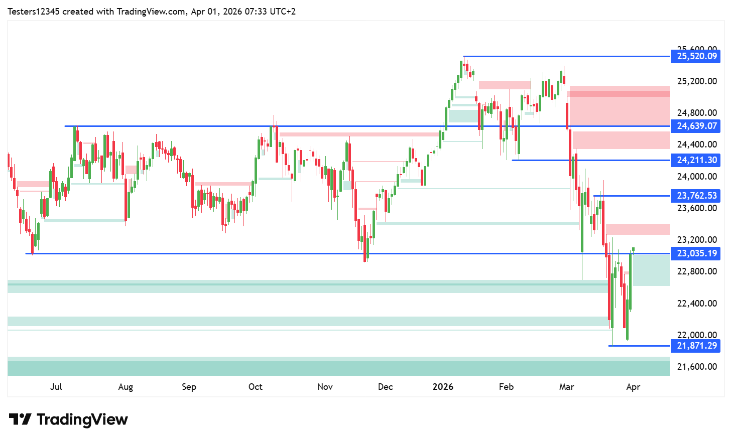 Celkově na indexu probíhá klesající pohyb v rámci kterého jsou korekce jako byla ta včerejší běžné. Cena by mohla vyplnit medvědí Fair Value Gap, jehož horní hrana je na 24 067 bodech. Nejbližší rezistence je u hodnoty 23 988 bodů, což je předchozí proražený support. V této oblasti se zdá být příležitost ke vstupům ve směru short.