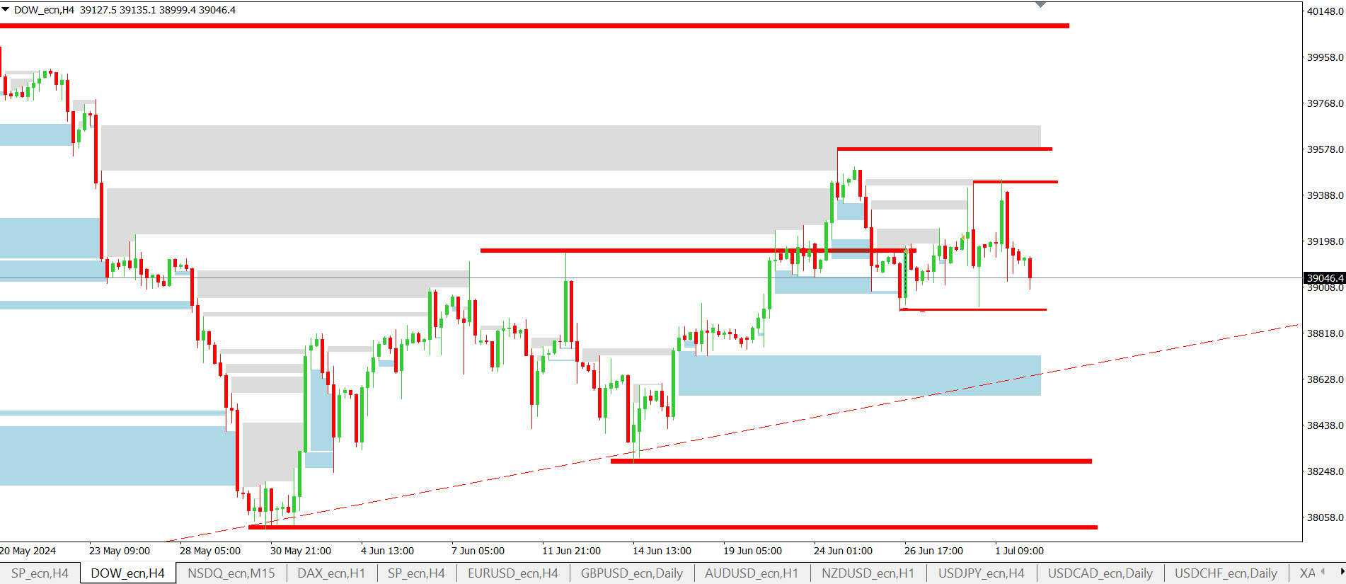 Nejbližší rezistence je 39 446. Support je u 38 917. Silný support může být spodní hrana býčího Fair Value Gapu, který je na hodnotě 38 566. Zde je konfluence s rostoucí trendovou linií. V případě vzniku falešného breaku na této linii, který by indikoval výběr likvidity, by pak byl možné spekulovat ve směru long.