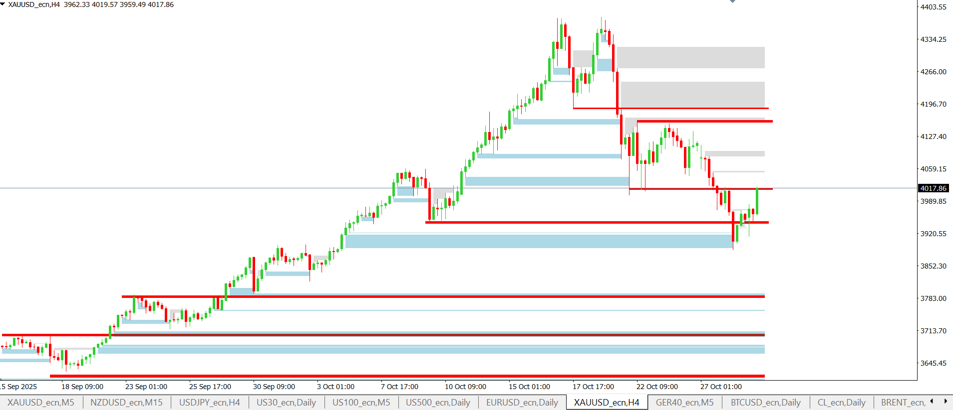 Aktuálně cena zlata retestuje rezistenci, která je na hodnotě kolem 4 015 USD. Toto by pro spekulanty ve směru short mohla být zajímavá hodnota. Je ovšem nutné počkat na potvrzení, protože se může stát, že cena tuto hodnotu prorazí a bude pokračovat směrem nahoru.