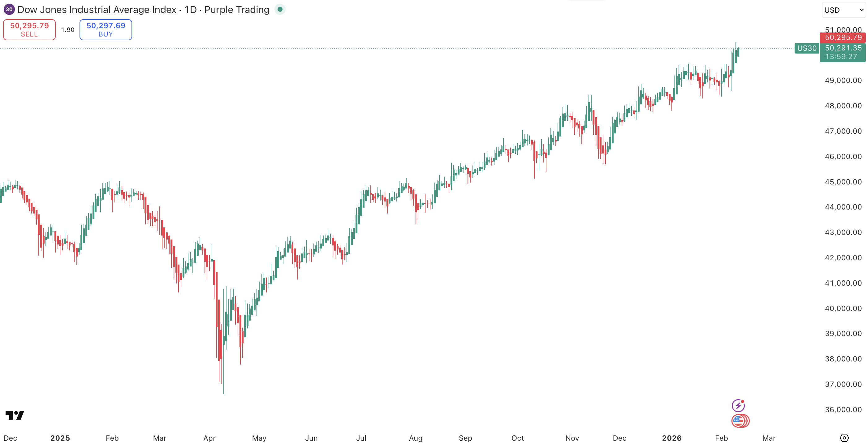 Akciový index Dow Jones Industrial Average, zdroj: TradingView