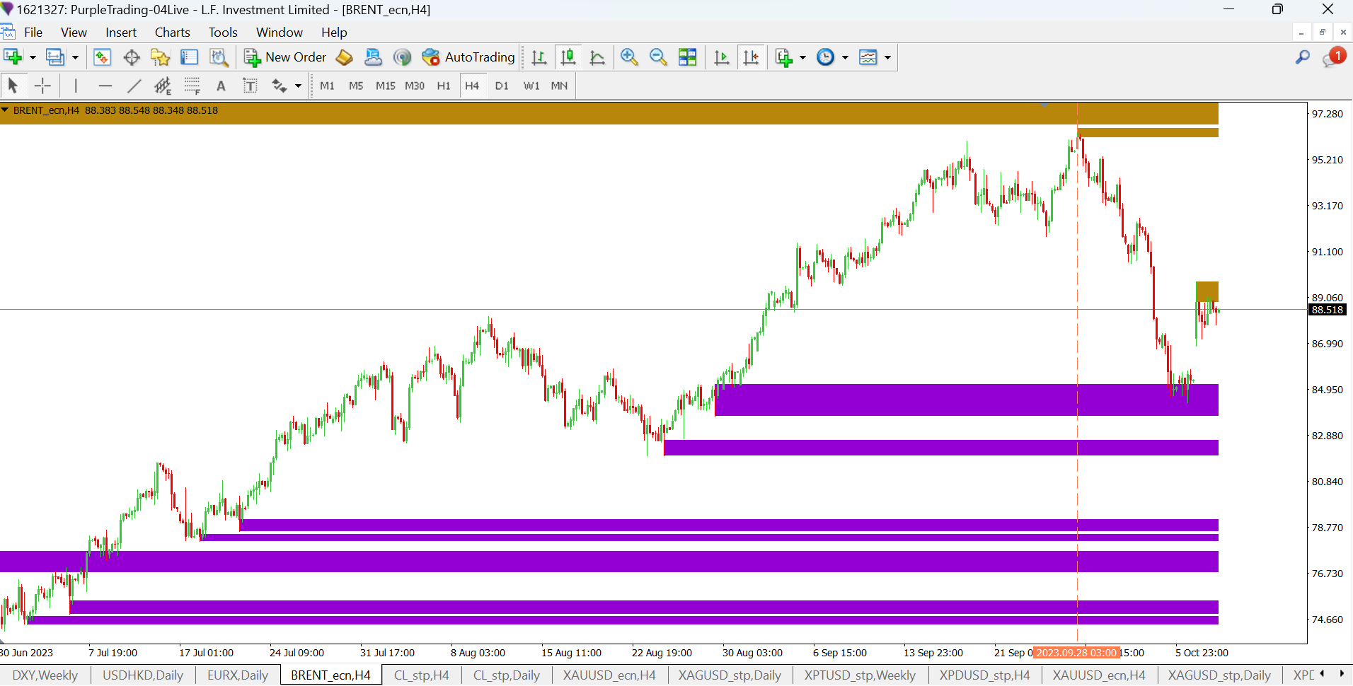CFD (Rozdílové smlouvy) jsou složité nástroje, u kterých je vysoké riziko rychlé ztráty peněz v důsledku pákového efektu. U 71.65 % účtů retailových investorů došlo při obchodování s CFD (rozdílovými smlouvami) u tohoto poskytovatele ke vzniku ztráty. Měli byste zvážit, zda si můžete dovolit vysoké riziko ztráty svých prostředků. Obchodování s cizími měnami na marži s sebou nese vysokou míru rizika a nemusí být vhodné pro všechny investory. Vysoká míra pákového efektu může působit ve váš prospěch, ale i neprospěch. Než se rozhodnete obchodovat foreign exchange , měli byste pečlivě zvážit své investiční cíle, úroveň zkušeností a ochotu riskovat. Existuje možnost, že byste mohli přijít o část nebo celou svou počáteční investici, a proto byste neměli investovat peníze, které si nemůžete dovolit ztratit. Měli byste si být vědomi všech rizik spojených s obchodováním foreign exchange a v případě pochybností byste měli požádat o radu nezávislého finančního poradce. Veškeré názory, zprávy, výzkumy, analýzy, ceny nebo jiné informace obsažené v tomto dokumentu jsou poskytovány jako obecné informace k trhu a nepředstavují investiční poradenství. Společnost L.F. Investment Limited nepřebírá odpovědnost za jakoukoli ztrátu nebo škodu, zejména včetně ušlého zisku, které mohou přímo nebo nepřímo vzniknout v důsledku toho, že použijete nebo se spolehnete na tyto informace. Purple Trading je kyperská národní ochranná známka (č. 85981), národní ochranná známka Spojeného království (č. UK00003696619) a ochranná známka Evropské unie (č. 018332329) vlastněná a používaná společností L.F. Investment Limited, 11, Louki Akrita, CY-4044 Lemesos, Kypr, licencovanou kyperskou investiční společností regulovanou institucí CySEC, s licencí č. 271/15.