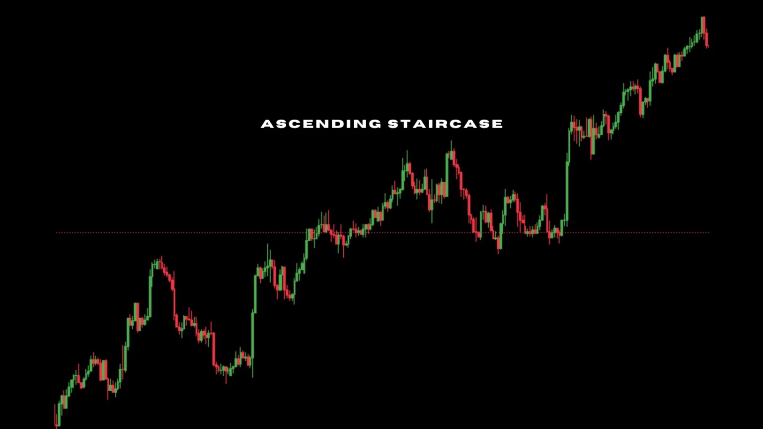 - Stoupající schody: série vyšších maxim a minim → býčí trend.