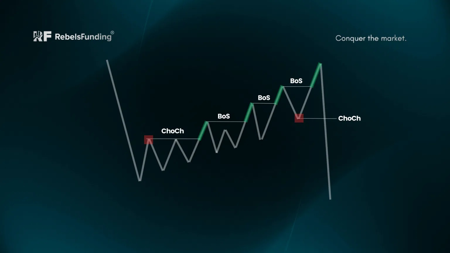 - Break of Structure (BOS) — potvrzuje pokračování trendu.