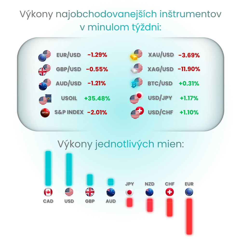 Minulý týždeň najvýraznejšie dominoval americký dolár ajj s tým kanadským, ktorý získaval podporu najmä vďaka prudkému rastu cien ropy (hodnota najvyššia od roku 2022). To dáva zmysel, keďže Kanada patrí medzi najväčších exportérov ropy na svete a ropa je jedným z jej kľúčových exportných artiklov.