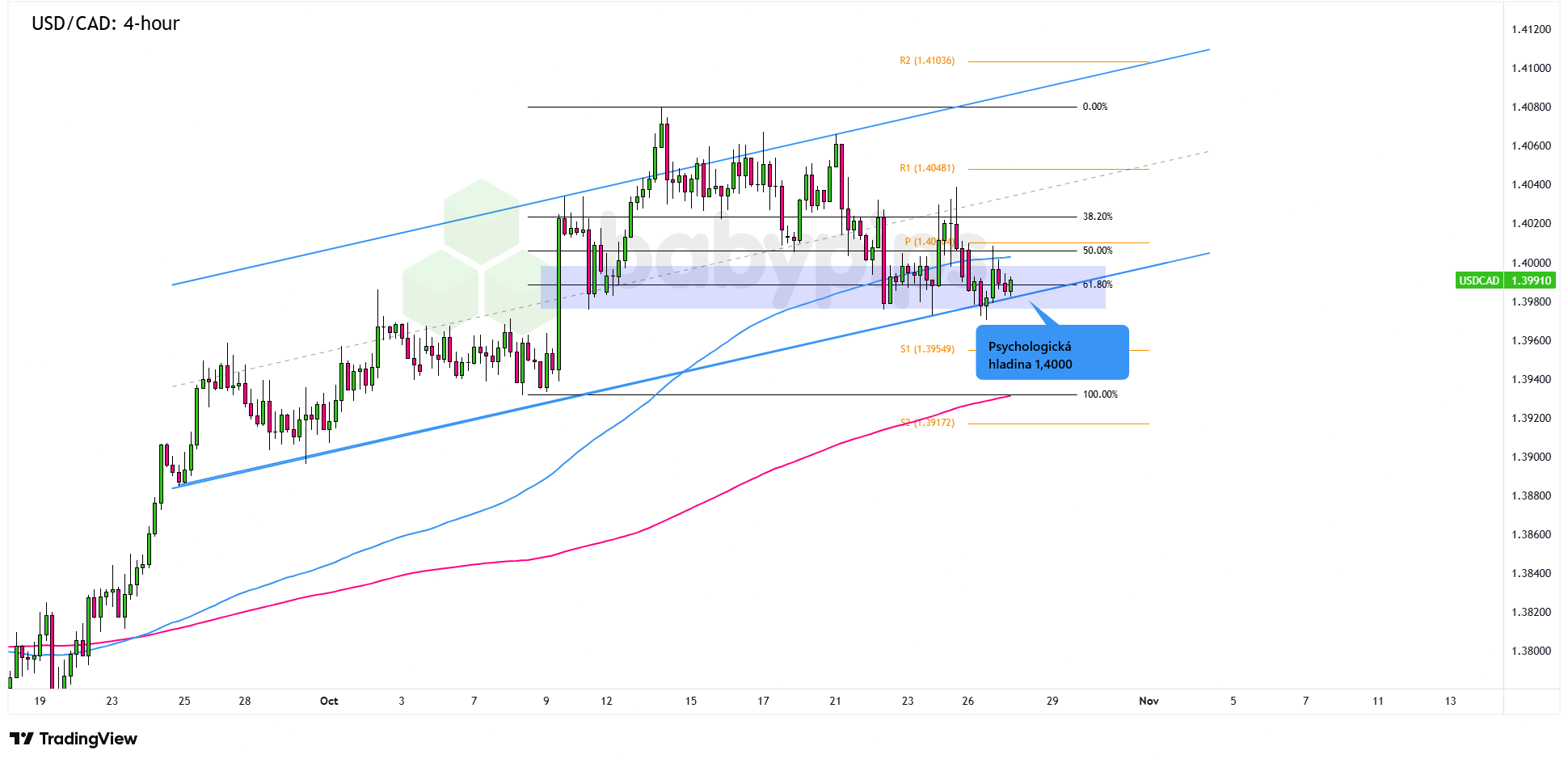 Měnový pár USD/CAD na 4hodinovém grafu aktuálně testuje klíčový support rostoucího trendového kanálu kolem psychologické hladiny 1,4000, který koresponduje s vyznačenou S/R zónou a také s úrovní 61,8 % Fibonacciho retracementu. Najdou kolem současných úrovní znovu sílu býci a bude pokračovat rostoucí trend? Nebo se naopak dočkáme průrazu směrem dolů s možnou změnou krátkodobého trendu?