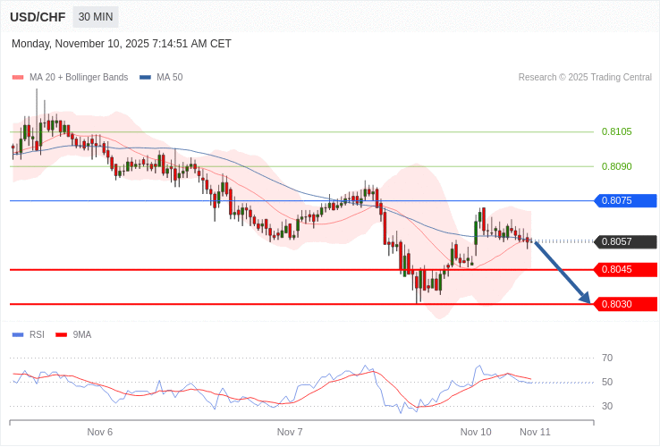 Komentář: Průraz pod hladinu 0,8045 by mohl vyvolat pokles směrem k 0,8030.