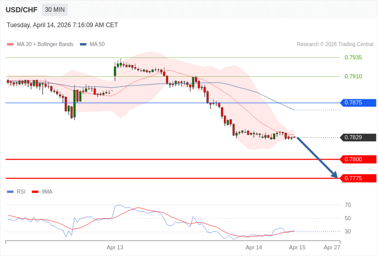 Komentář: Dokud se USD/CHF bude obchodovat pod rezistencí 0,7875, tak je pravděpodobný průraz pod hladinu 0,7800.