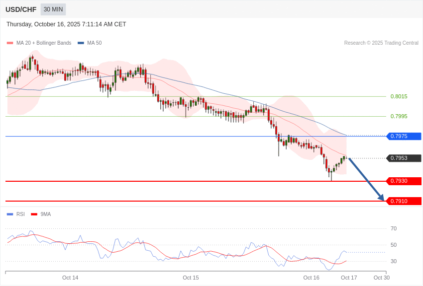 Komentář: Dokud se USD/CHF bude obchodovat pod rezistencí 0,7975, tak je pravděpodobný průraz pod hladinu 0,7930.