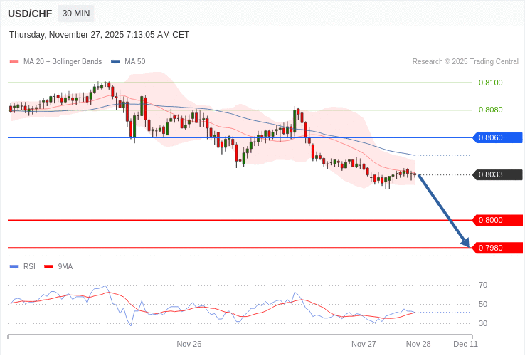 Komentář: Dokud se USD/CHF bude obchodovat pod rezistencí 0,8060, tak je pravděpodobný pohyb do strany s mírnou medvědí tendencí.