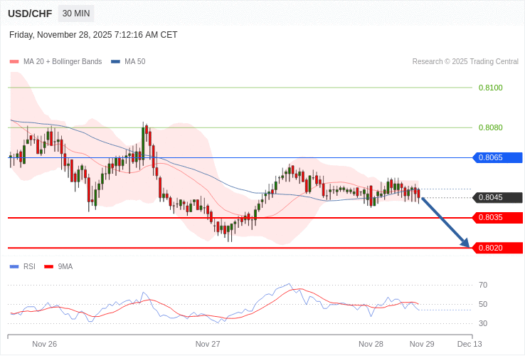 Komentář: Průraz pod hladinu 0,8035 by mohl vyvolat pokles směrem k 0,8020.
