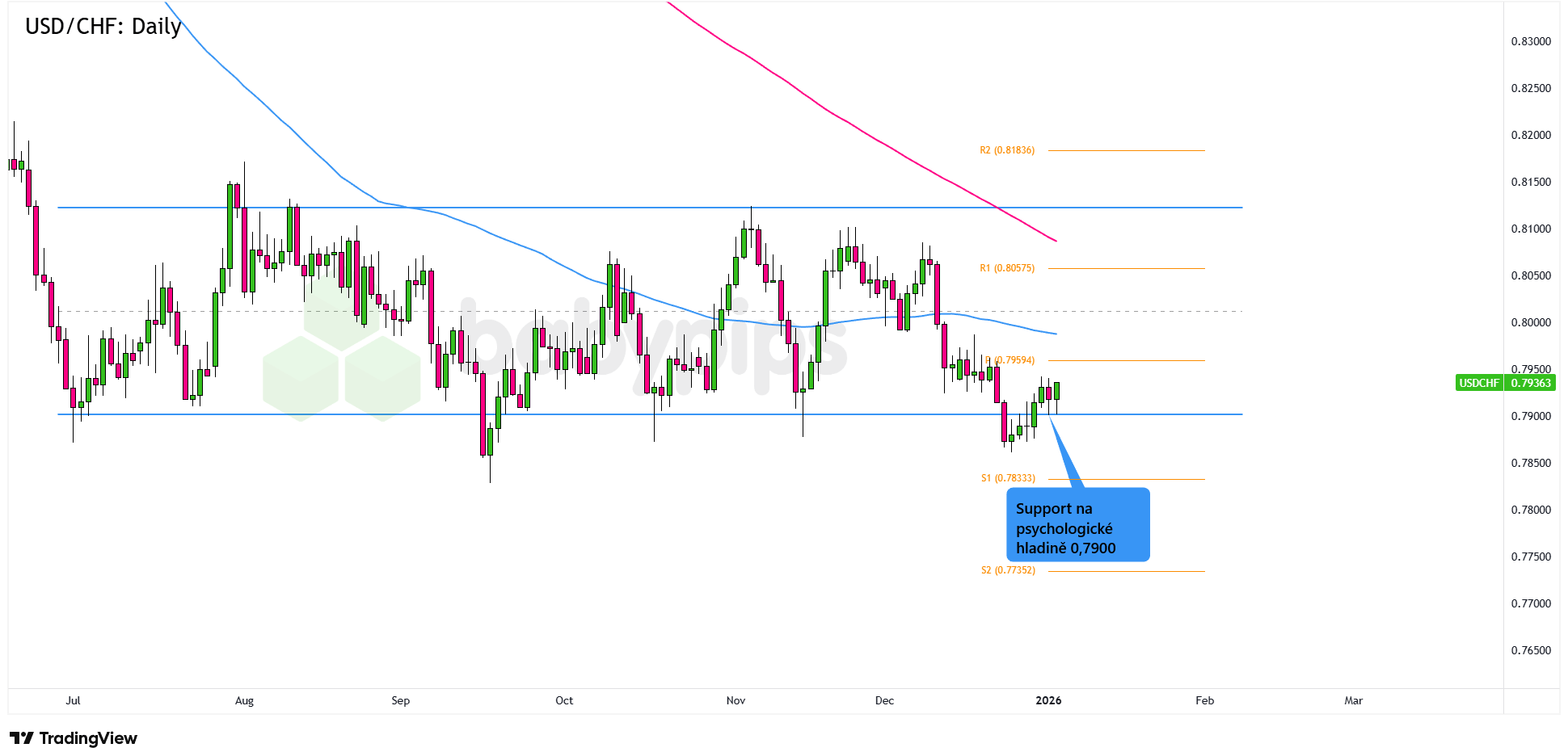 Měnový pár USD/CHF se na denním grafu aktuálně odráží směrem vzhůru od klíčového supportu obchodního pásma kolem psychologické hladiny 0,7900. Najdou tak kolem současných úrovní znovu sílu býci a posílíme zpět směrem k rezistenci obchodního pásma nebo alespoň k jeho středové linii?