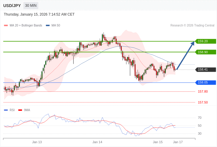 Preferovaný scénář: Dlouhé (long) pozice nad 158,05 s cílem na 158,90 a dále pak až na 159,20.
