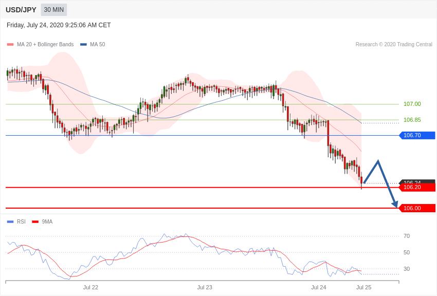 Preferovaný scénář: Krátké (short) pozice pod 106,70 s cílem na 106,20 a dále pak až na 106,00.