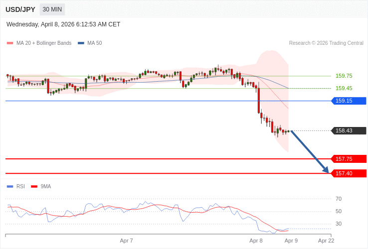 Preferovaný scénář: Krátké (short) pozice pod 159,15 s cílem na 157,75 a dále pak až na 157,40.