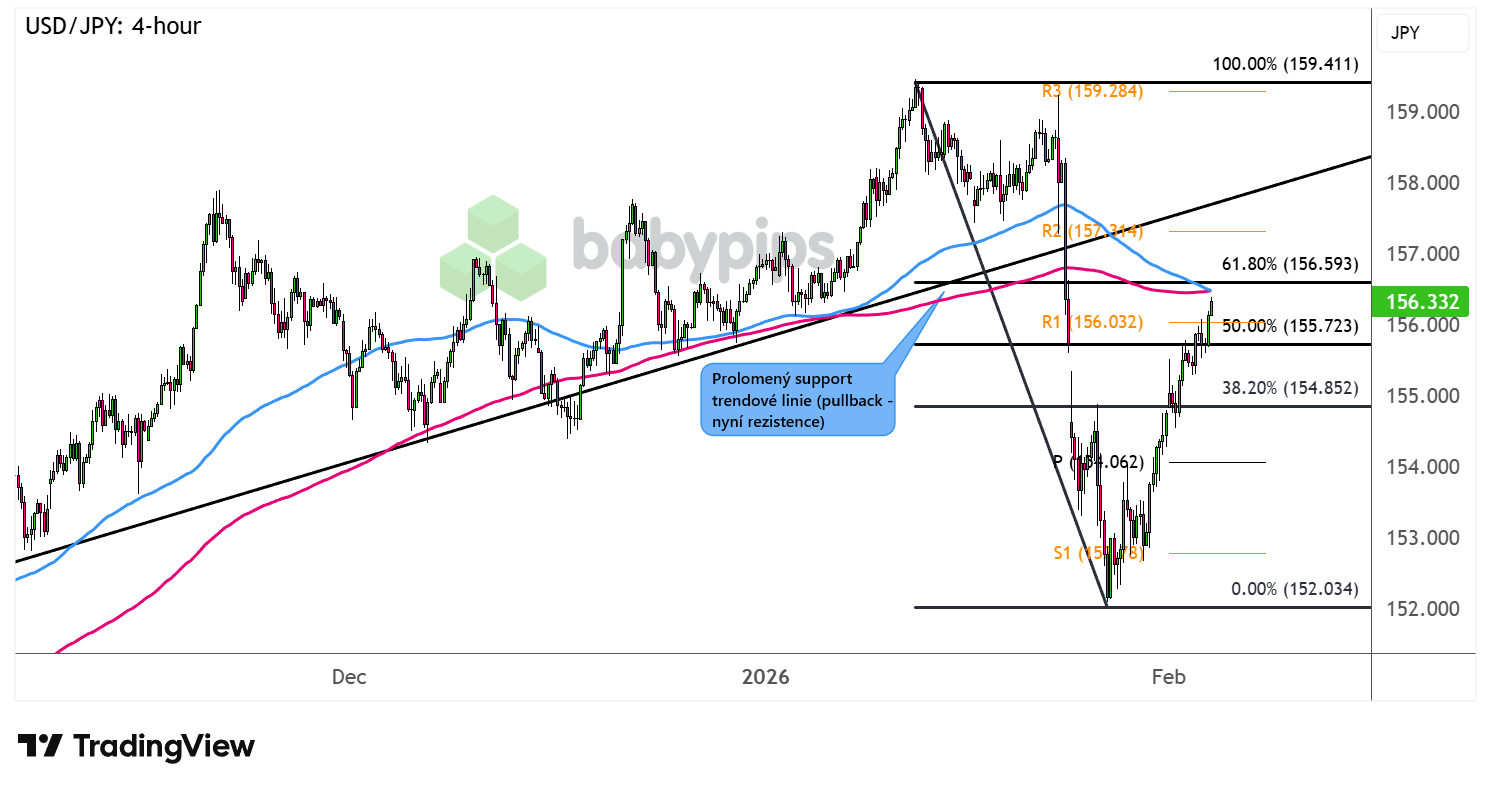 Měnový pár USD/JPY se na 4hodinovém grafu po velkém výprodeji vrací zpět směrem k již dříve prolomené rostoucí trendové linii (dříve support - nyní rezistence) poblíž psychologické hladiny 157,00. Dočkáme se posílení do této zmíněné prolomené oblasti a následného odražení (pullback) zpět k nižším úrovním? Nebo naopak dojde k návratu nad prolomenou trendovou linii a bude pokračovat rostoucí trend?