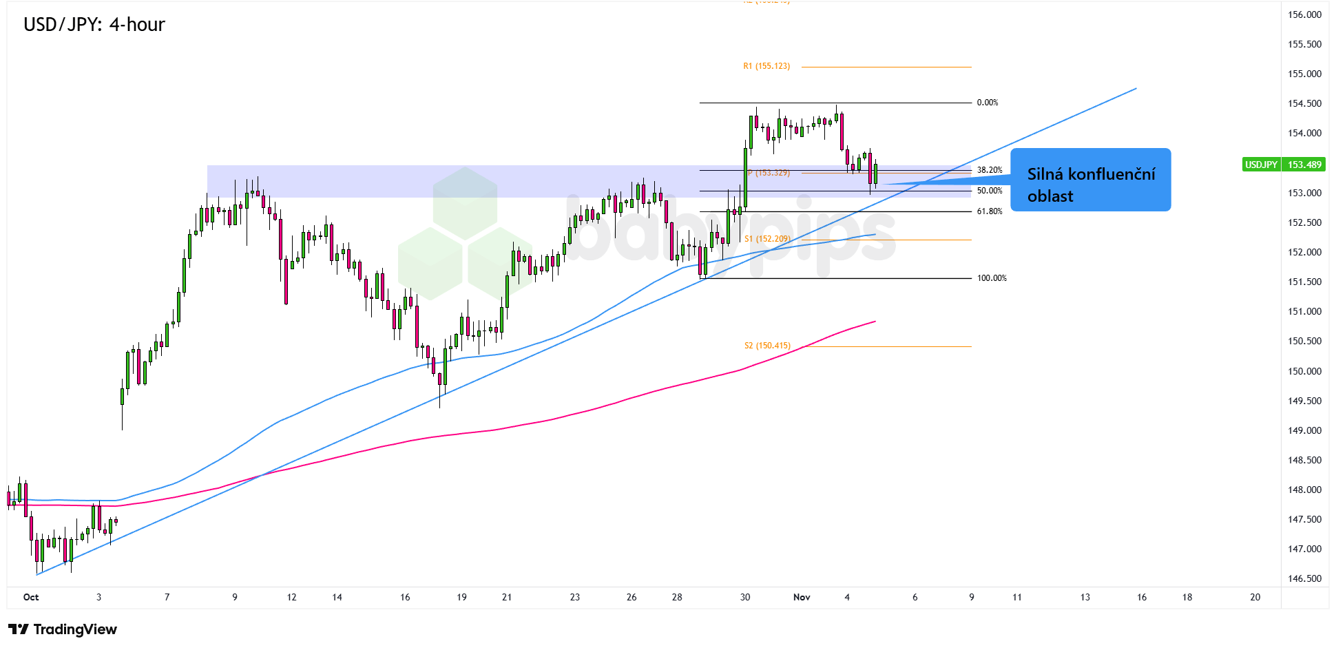 Měnový pár USD/JPY se na 4hodinovém grafu postupně vrátil zpět směrem k již dříve prolomené oblasti rezistence (throwback – nyní support), která se nachází na psychologické hladině 153,00 a zároveň koresponduje s úrovní 38,2 a 50 % Fibonacciho retracementu a také s úrovní standartního Pivot Pointu. Najdou tak kolem současných úrovní znovu sílu býci a bude pokračovat rostoucí trend?