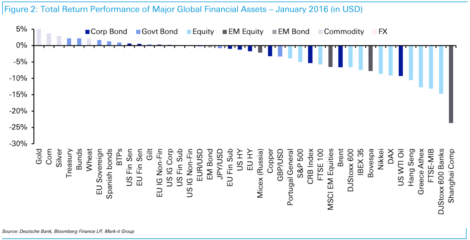 Pro akciové trhy byly první lednové dny vůbec nejhorším startem v historii. Samotný leden pak byl pro akciové indexy Dow Jones a S&P 500 nejslabším měsícem od roku 2009. Čínské akcie pokračovaly ve volném pádu a ropa klesla na nejnižší úrovně za posledních 12 let. V podstatě jediné, co během ledna neztratilo na hodnotě, bylo zlato, stříbro a americké státní dluhopisy.