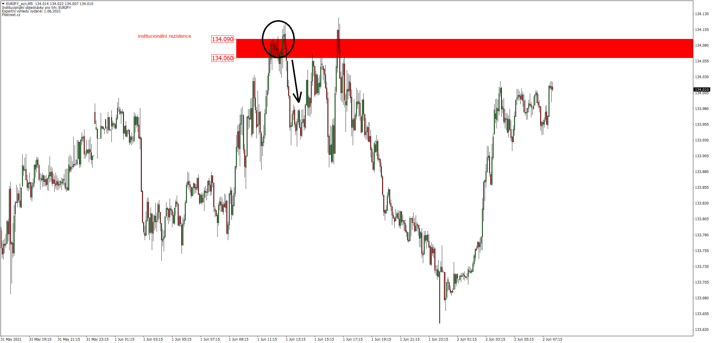 Pokud trh naopak na zveřejněné hladiny nereagoval, zaznamenali jsme ztrátu o velikosti 15-20 pipů (potenciální maximální fixní Stop-Loss) v závislosti na šířce dané institucionální objednávky. Naše institucionální objednávky se tedy obchodují s relativně nízkým rizikem.