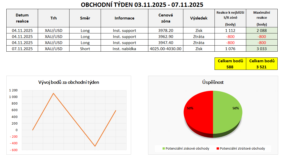 Nově rovněž zaznamenáváme reakce na trhu se zlatem (XAU/USD). Na tomto trhu byly minulý týden celkem 4 obchodních příležitosti, z nichž 2 byly úspěšné. To představuje úspěšnost 50 %. Celkově bylo možné za minulý týden potencionálně zachytit reakce ve výši 588 bodů. Pokud trh na institucionální objednávku nereagoval, zaznamenali jsme ztrátu 400 - 1500 bodů v závislosti na šířce dané institucionální objednávky a volatilitě.