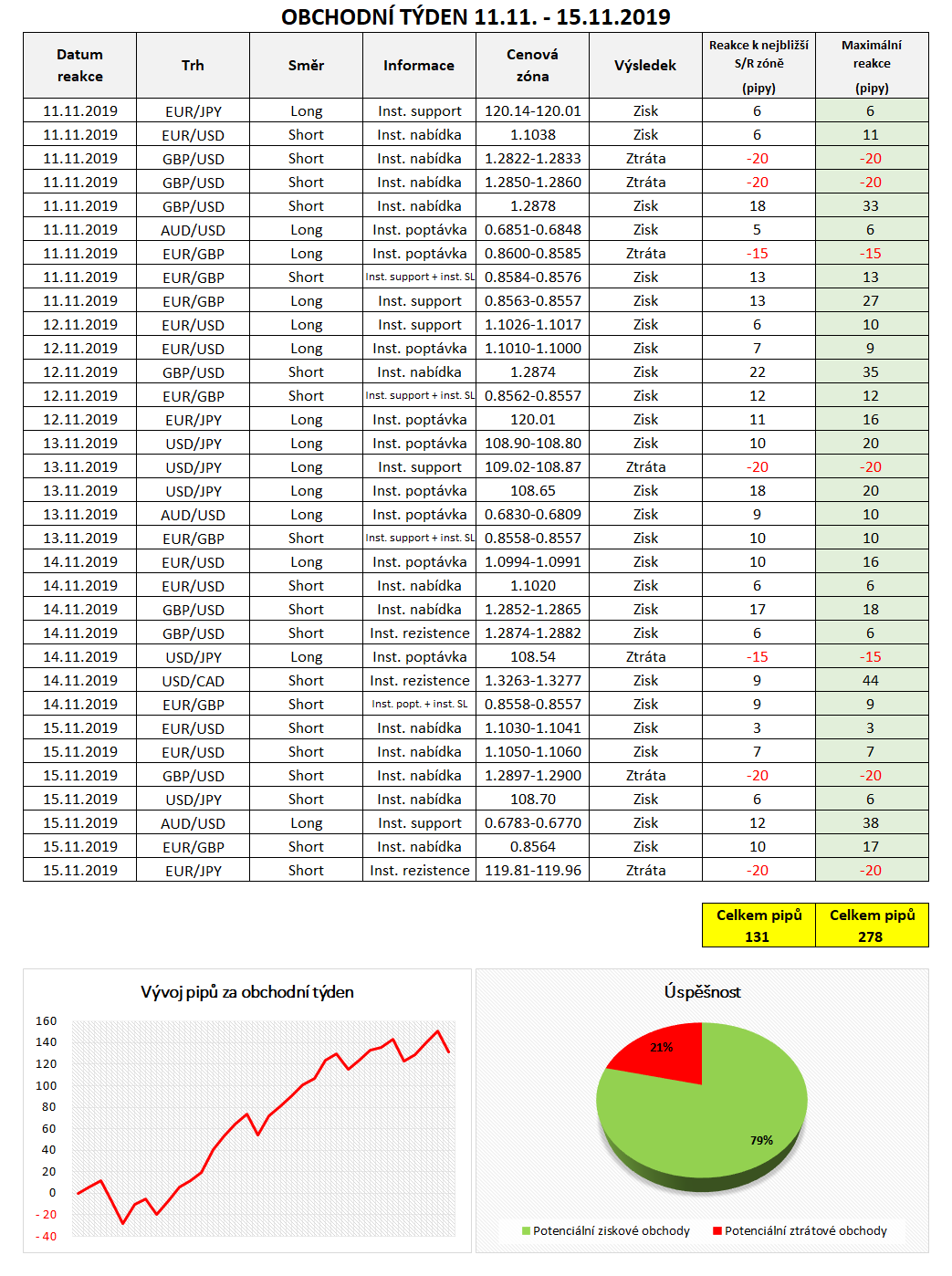 Na základě informací z mezibankovního trhu bylo v minulém týdnu možné vstoupit do 33 obchodů, z nichž 26 by bylo ziskových a 7 ztrátových. Celková úspěšnost tak byla 79 %. Celkově bylo možné za minulý týden potencionálně zachytit reakce ve výši 131 pipů, bereme-li v úvahu potenciální umístění Profit-Targetu k nejbližší S/R zóně. Stop-Loss naopak nejčastěji umisťujeme na logické místo ve vzdálenosti 15 - 20 pipů v závislosti na šířce dané institucionální objednávky. Konkrétní obchodní příležitosti jsme zaznamenali do tabulky níže, přidáváme také equity křivku v pipech.