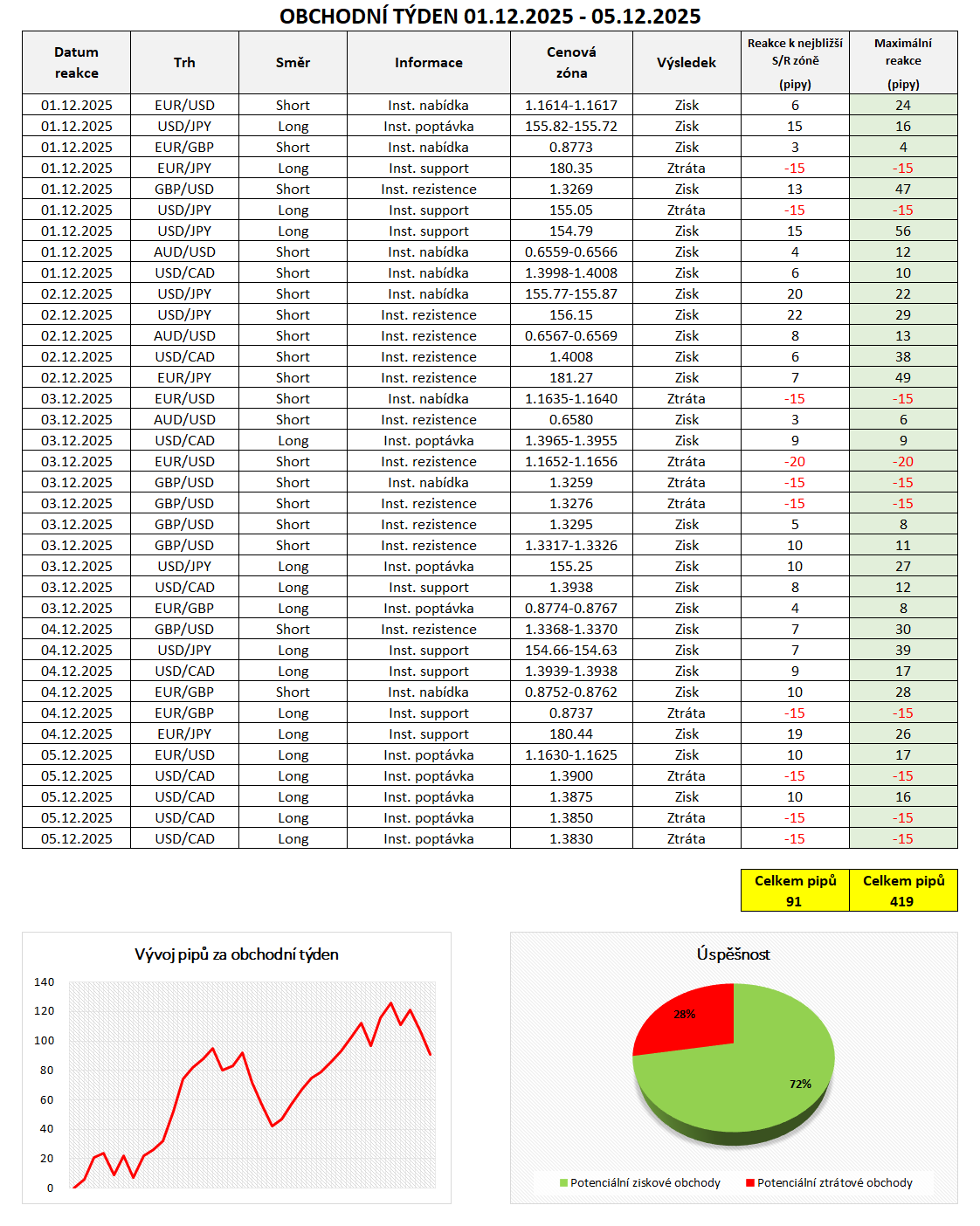 Na základě informací z mezibankovního trhu bylo v minulém týdnu možné vstoupit do 36 obchodů, z nichž 26 by bylo ziskových a 10 ztrátových. Celková úspěšnost tak byla 72 %. Celkově bylo možné za minulý týden potencionálně zachytit reakce ve výši 91 pipů, bereme-li v úvahu potenciální umístění Profit-Targetu k nejbližší S/R zóně. Stop-Loss naopak nejčastěji umisťujeme na logické místo ve vzdálenosti 15 - 20 pipů v závislosti na šířce dané institucionální objednávky a volatilitě. Konkrétní obchodní příležitosti jsme zaznamenali do tabulky níže, přidáváme také equity křivku v pipech.
