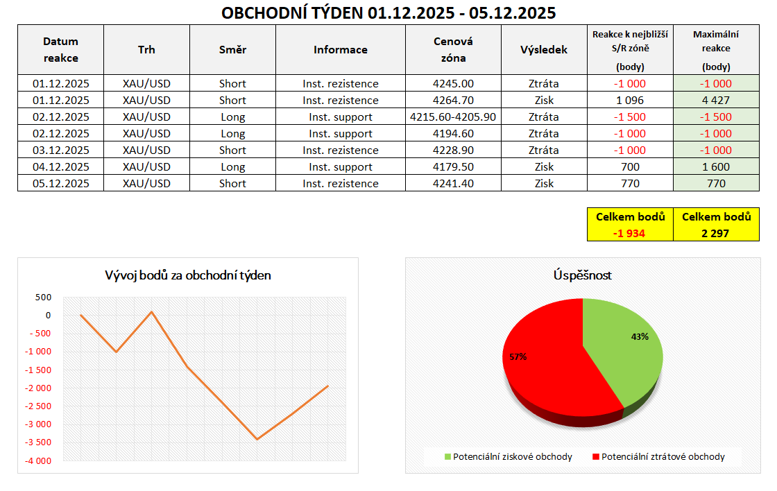 Nově rovněž zaznamenáváme reakce na trhu se zlatem (XAU/USD). Na tomto trhu byly minulý týden celkem 7 obchodních příležitosti, z nichž 3 byly úspěšné. To představuje úspěšnost 43 %. Celkově skončil minulý týden ztrátou -1934 bodů. Pokud trh na institucionální objednávku nereagoval, zaznamenali jsme ztrátu 400 - 1500 bodů v závislosti na šířce dané institucionální objednávky a volatilitě.