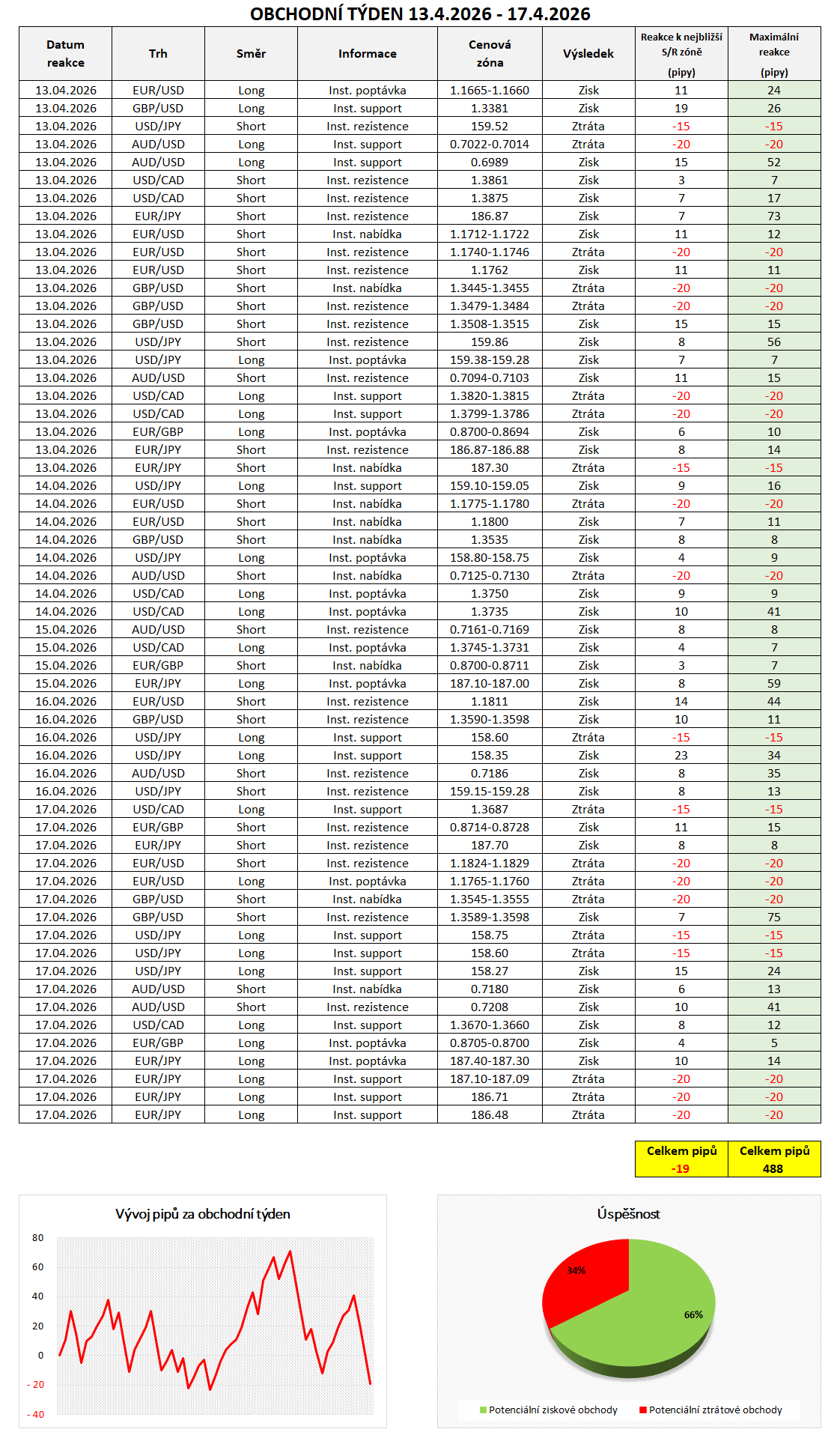 Na základě informací z mezibankovního trhu bylo v minulém týdnu možné vstoupit do 58 obchodů, z nichž 38 by bylo ziskových a 20 ztrátových. Celková úspěšnost tak byla 66 %. Celkově skončil minulý mírnou ztrátou ve výši 43 pipů, bereme-li v úvahu potenciální umístění Profit-Targetu k nejbližší S/R zóně. Stop-Loss naopak nejčastěji umisťujeme na logické místo ve vzdálenosti 15 - 20 pipů v závislosti na šířce dané institucionální objednávky a volatilitě. Konkrétní obchodní příležitosti jsme zaznamenali do tabulky níže, přidáváme také equity křivku v pipech.