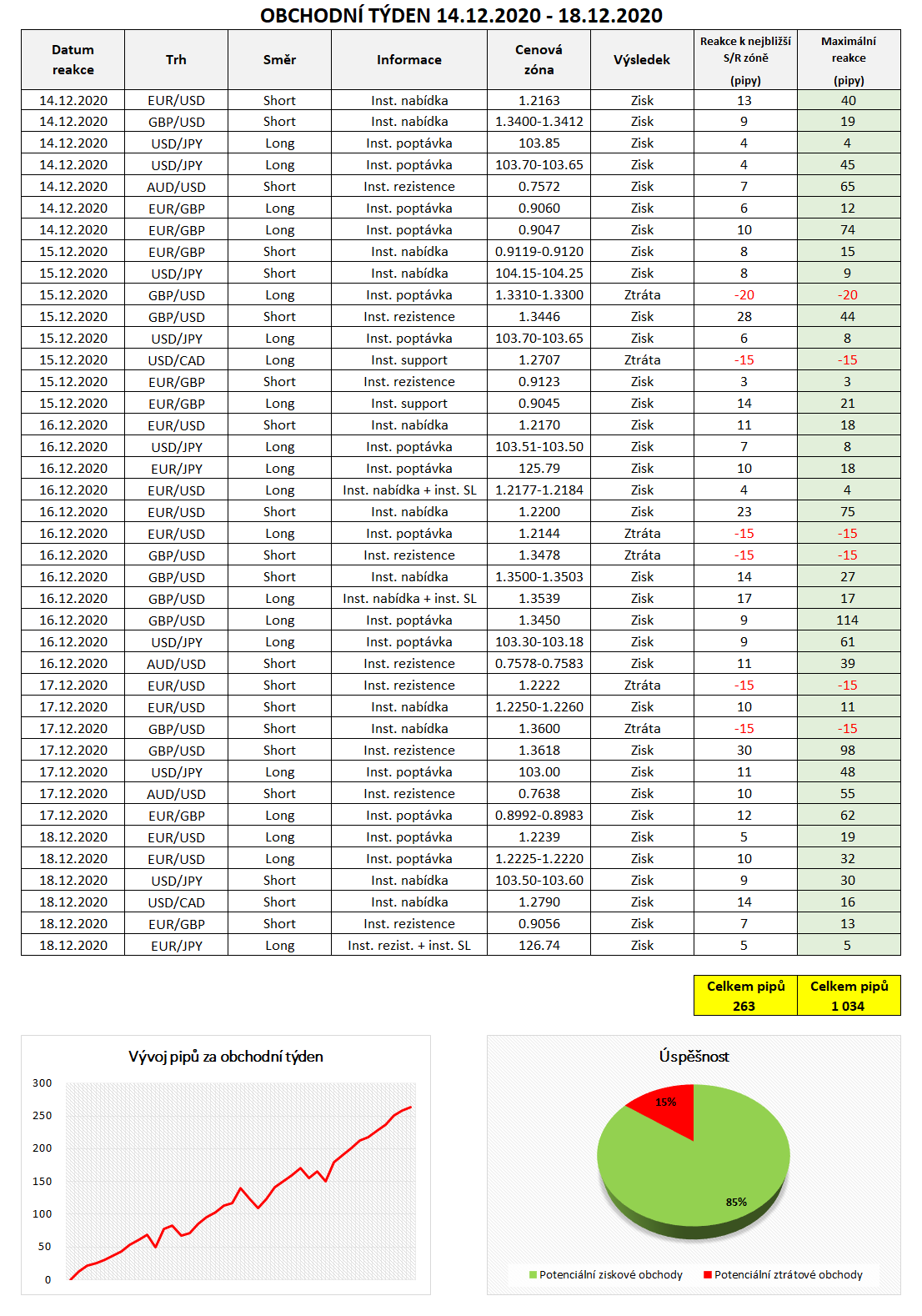 Na základě informací z mezibankovního trhu bylo v minulém týdnu možné vstoupit do 40 obchodů, z nichž 34 by bylo ziskových a 6 ztrátových. Celková úspěšnost tak byla 85 %. Celkově bylo možné za minulý týden potencionálně zachytit reakce ve výši 263 pipů, bereme-li v úvahu potenciální umístění Profit-Targetu k nejbližší S/R zóně. Stop-Loss naopak nejčastěji umisťujeme na logické místo ve vzdálenosti 15 - 20 pipů v závislosti na šířce dané institucionální objednávky. Konkrétní obchodní příležitosti jsme zaznamenali do tabulky níže, přidáváme také equity křivku v pipech.