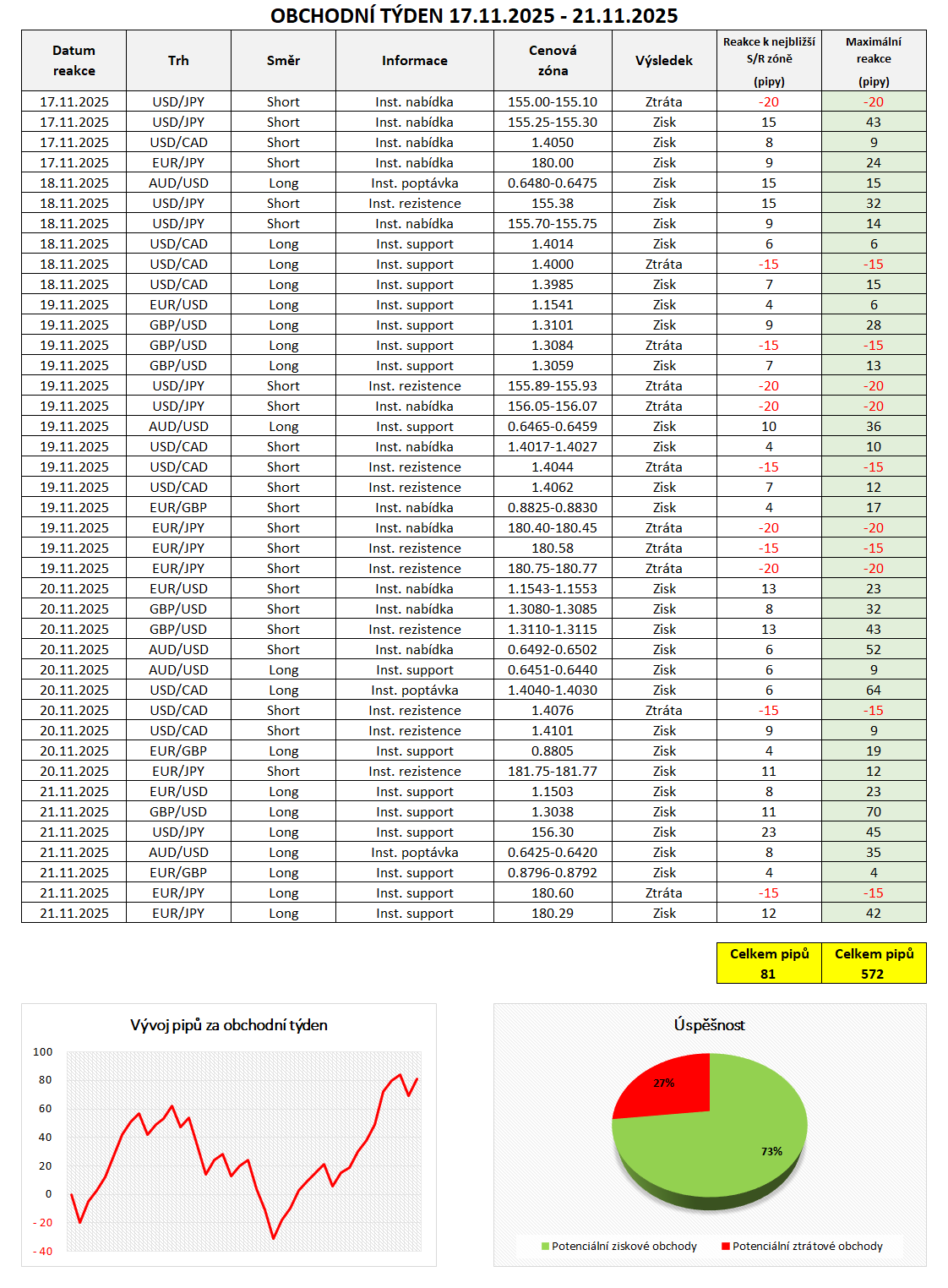 Na základě informací z mezibankovního trhu bylo v minulém týdnu možné vstoupit do 41 obchodů, z nichž 30 by bylo ziskových a 11 ztrátových. Celková úspěšnost tak byla 73 %. Celkově bylo možné za minulý týden potencionálně zachytit reakce ve výši 81 pipů, bereme-li v úvahu potenciální umístění Profit-Targetu k nejbližší S/R zóně. Stop-Loss naopak nejčastěji umisťujeme na logické místo ve vzdálenosti 15 - 20 pipů v závislosti na šířce dané institucionální objednávky a volatilitě. Konkrétní obchodní příležitosti jsme zaznamenali do tabulky níže, přidáváme také equity křivku v pipech.