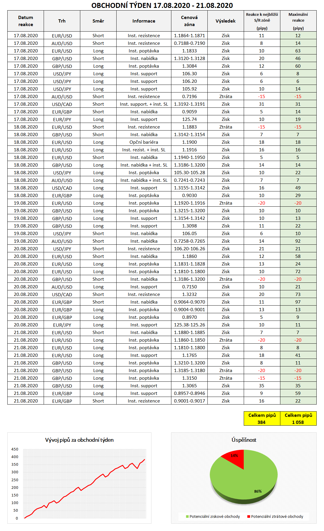 Na základě informací z mezibankovního trhu bylo v minulém týdnu možné vstoupit do 49 obchodů, z nichž 42 by bylo ziskových a 7 ztrátových. Celková úspěšnost tak byla 86 %. Celkově bylo možné za minulý týden potencionálně zachytit reakce ve výši 384 pipů, bereme-li v úvahu potenciální umístění Profit-Targetu k nejbližší S/R zóně. Stop-Loss naopak nejčastěji umisťujeme na logické místo ve vzdálenosti 15 - 20 pipů v závislosti na šířce dané institucionální objednávky. Konkrétní obchodní příležitosti jsme zaznamenali do tabulky níže, přidáváme také equity křivku v pipech.