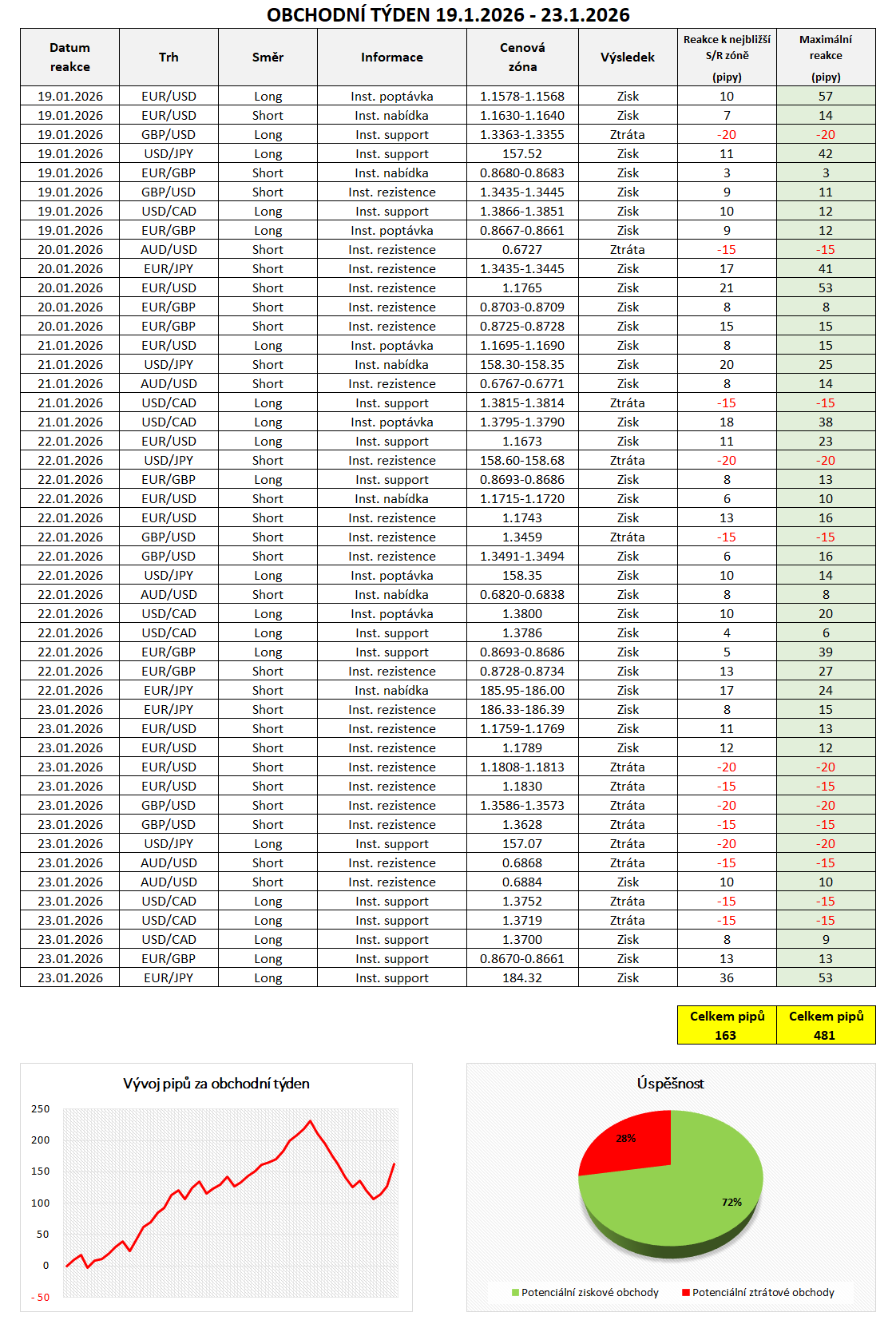 Na základě informací z mezibankovního trhu bylo v minulém týdnu možné vstoupit do 47 obchodů, z nichž 34 by bylo ziskových a 13 ztrátových. Celková úspěšnost tak byla 72 %. Celkově bylo možné za minulý týden potencionálně zachytit reakce ve výši 163 pipů, bereme-li v úvahu potenciální umístění Profit-Targetu k nejbližší S/R zóně. Stop-Loss naopak nejčastěji umisťujeme na logické místo ve vzdálenosti 15 - 20 pipů v závislosti na šířce dané institucionální objednávky a volatilitě. Konkrétní obchodní příležitosti jsme zaznamenali do tabulky níže, přidáváme také equity křivku v pipech.