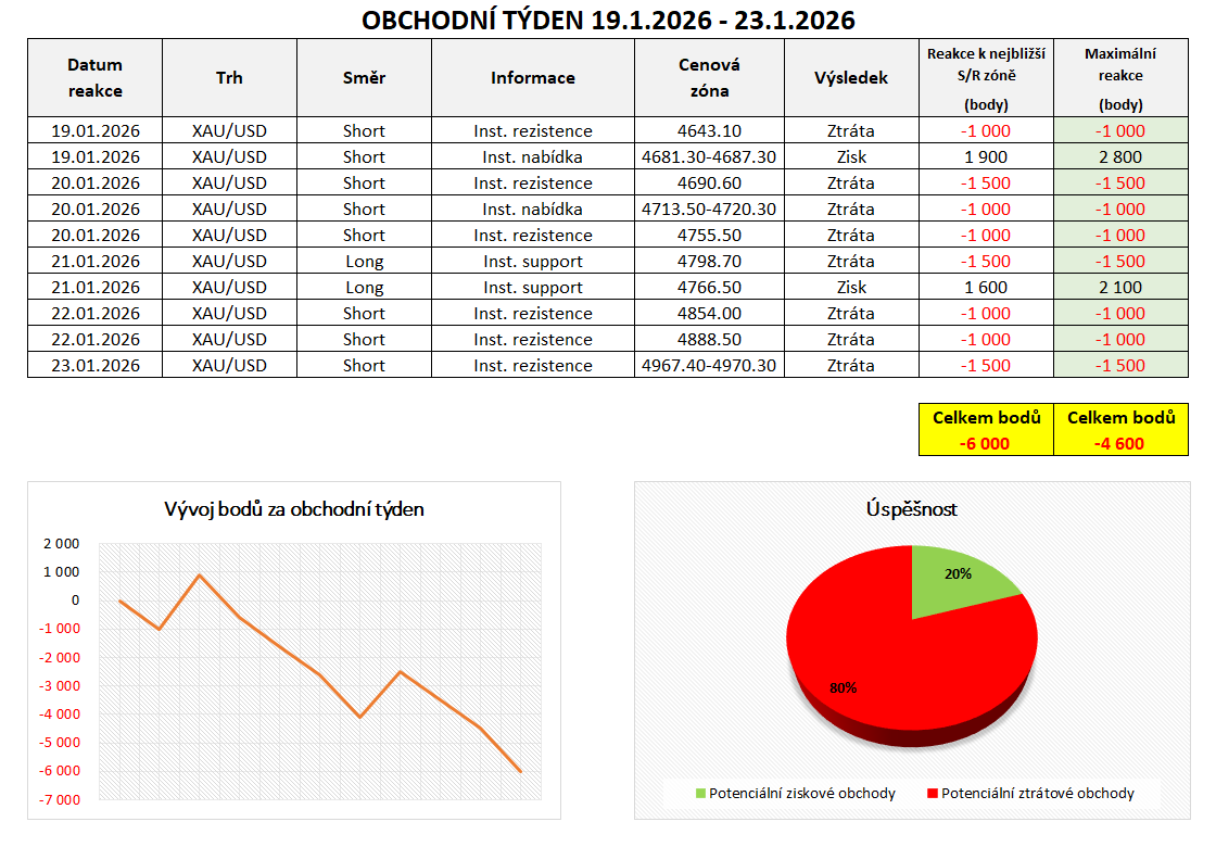 Rovněž zaznamenáváme reakce na trhu se zlatem (XAU/USD). Na tomto trhu bylo minulý týden celkem 10 obchodních příležitosti, z nichž 2 byly úspěšné. To představuje úspěšnost 20 %. Celkově skončil minulý týden ztrátou -6000 bodů. Pokud trh na institucionální objednávku nereagoval, zaznamenali jsme ztrátu 400 - 1500 bodů v závislosti na šířce dané institucionální objednávky a volatilitě.