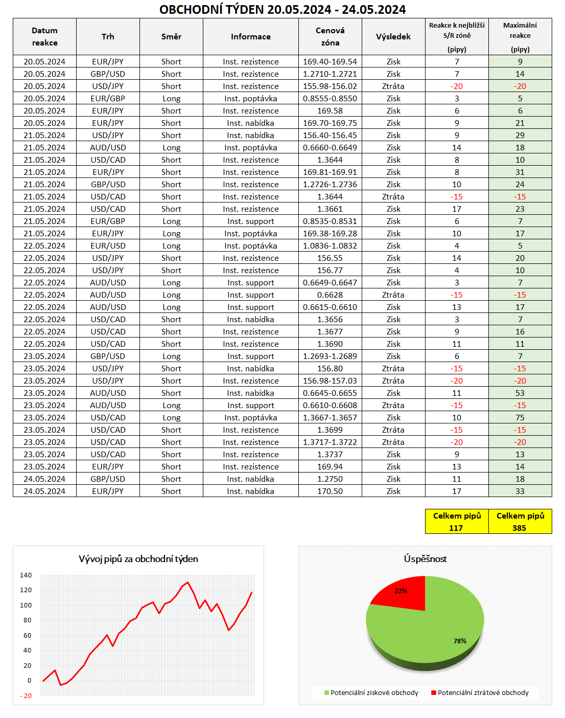 Na základě informací z mezibankovního trhu bylo v minulém týdnu možné vstoupit do 36 obchodů, z nichž 28 by bylo ziskových a 8 ztrátových. Celková úspěšnost tak byla 78 %. Celkově bylo možné za minulý týden potencionálně zachytit reakce ve výši 117 pipů, bereme-li v úvahu potenciální umístění Profit-Targetu k nejbližší S/R zóně. Stop-Loss naopak nejčastěji umisťujeme na logické místo ve vzdálenosti 15 - 20 pipů v závislosti na šířce dané institucionální objednávky. Konkrétní obchodní příležitosti jsme zaznamenali do tabulky níže, přidáváme také equity křivku v pipech.
