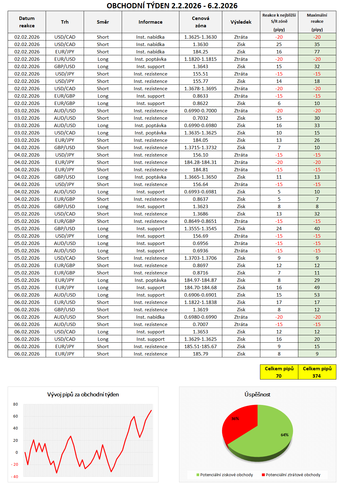 Na základě informací z mezibankovního trhu bylo v minulém týdnu možné vstoupit do 44 obchodů, z nichž 28 by bylo ziskových a 16 ztrátových. Celková úspěšnost tak byla 64 %. Celkově bylo možné za minulý týden potencionálně zachytit reakce ve výši 70 pipů, bereme-li v úvahu potenciální umístění Profit-Targetu k nejbližší S/R zóně. Stop-Loss naopak nejčastěji umisťujeme na logické místo ve vzdálenosti 15 - 20 pipů v závislosti na šířce dané institucionální objednávky a volatilitě. Konkrétní obchodní příležitosti jsme zaznamenali do tabulky níže, přidáváme také equity křivku v pipech.