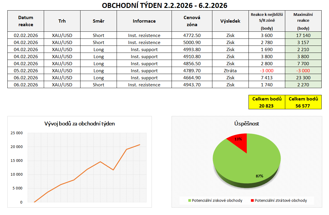 Rovněž zaznamenáváme reakce na trhu se zlatem (XAU/USD). Na tomto trhu bylo minulý týden celkem 8 obchodních příležitosti, z nichž 7 bylo úspěšných. To představuje úspěšnost 87 %. Celkově skončil minulý týden ziskem 20 823 bodů. Pokud trh na institucionální objednávku nereagoval, zaznamenali jsme ztrátu 1000 až 3000 bodů v závislosti na šířce dané institucionální objednávky a volatilitě.