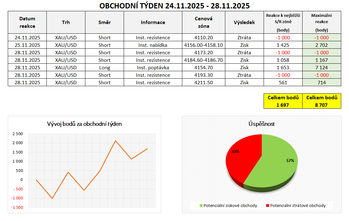 Nově rovněž zaznamenáváme reakce na trhu se zlatem (XAU/USD). Na tomto trhu byly minulý týden celkem 7 obchodních příležitosti, z nichž 4 byly úspěšné. To představuje úspěšnost 57 %. Celkově bylo možné za minulý týden potencionálně zachytit reakce ve výši 1697 bodů. Pokud trh na institucionální objednávku nereagoval, zaznamenali jsme ztrátu 400 - 1500 bodů v závislosti na šířce dané institucionální objednávky a volatilitě.
