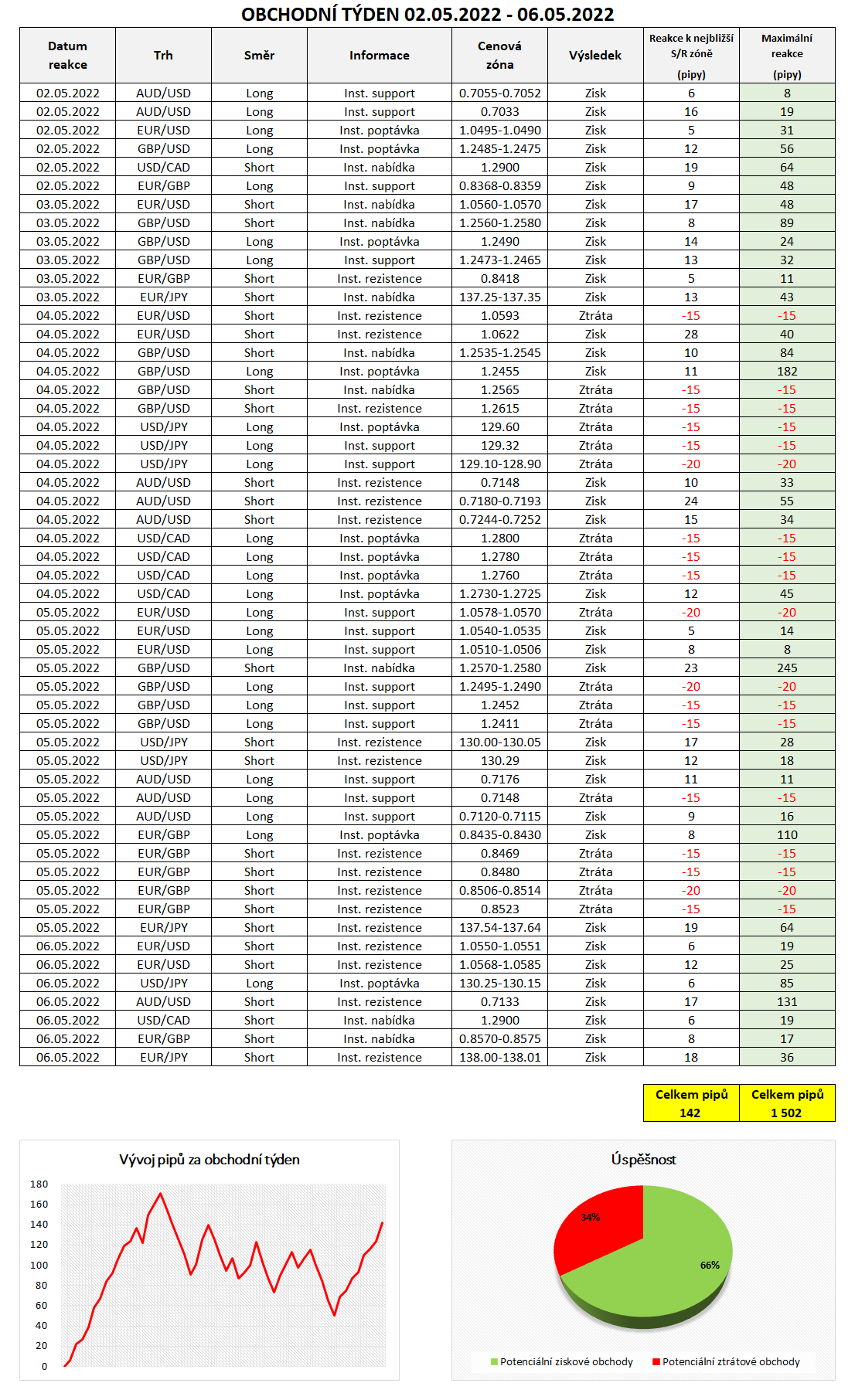 Na základě informací z mezibankovního trhu bylo v minulém týdnu možné vstoupit do 53 obchodů, z nichž 35 by bylo ziskových a 18 ztrátových. Celková úspěšnost tak byla 66 %. Celkově bylo možné za minulý týden potencionálně zachytit reakce ve výši 142 pipů, bereme-li v úvahu potenciální umístění Profit-Targetu k nejbližší S/R zóně. Stop-Loss naopak nejčastěji umisťujeme na logické místo ve vzdálenosti 15 - 20 pipů v závislosti na šířce dané institucionální objednávky. Konkrétní obchodní příležitosti jsme zaznamenali do tabulky níže, přidáváme také equity křivku v pipech.
