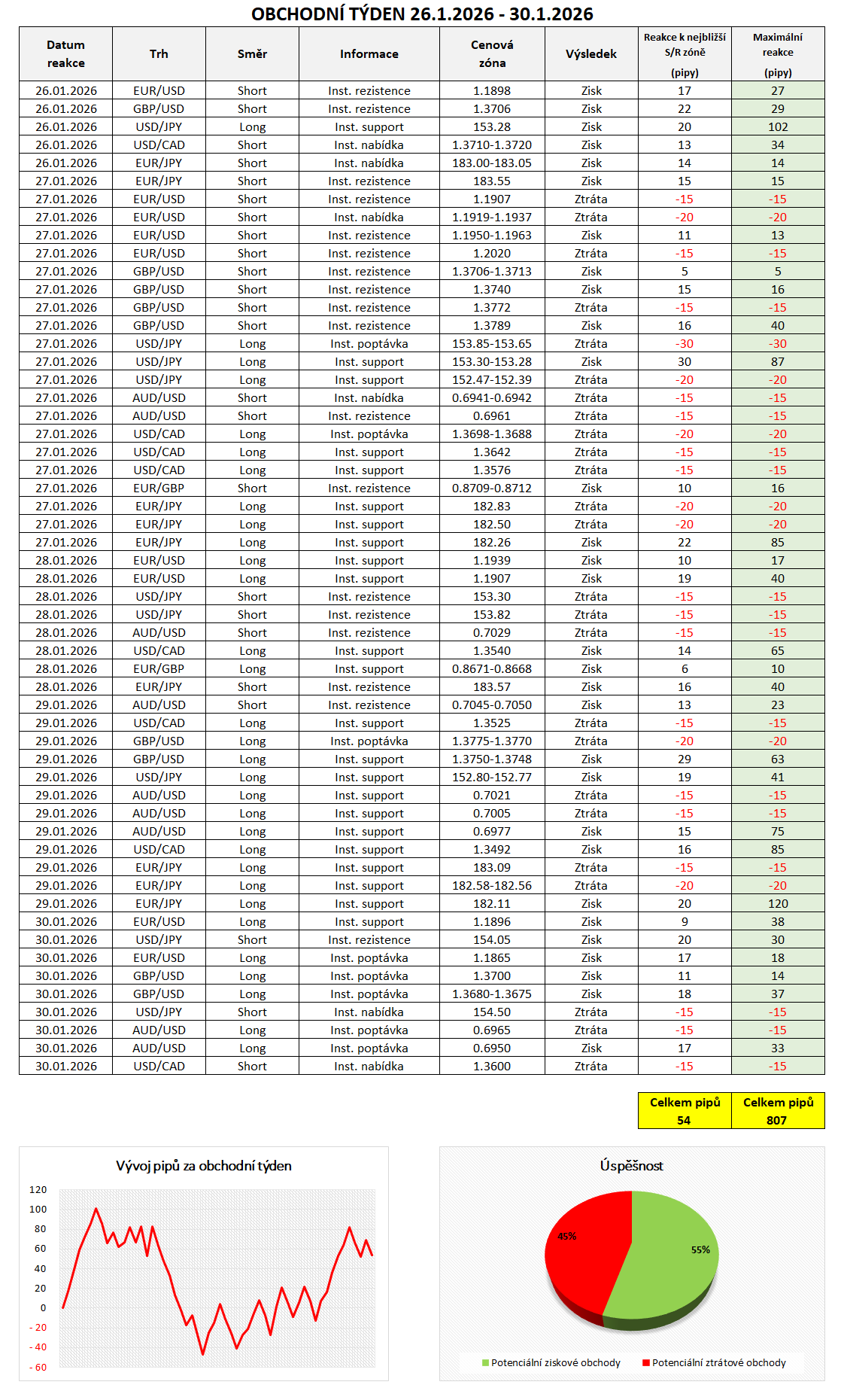 Na základě informací z mezibankovního trhu bylo v minulém týdnu možné vstoupit do 55 obchodů, z nichž 30 by bylo ziskových a 25 ztrátových. Celková úspěšnost tak byla 55 %. Celkově bylo možné za minulý týden potencionálně zachytit reakce ve výši 54 pipů, bereme-li v úvahu potenciální umístění Profit-Targetu k nejbližší S/R zóně. Stop-Loss naopak nejčastěji umisťujeme na logické místo ve vzdálenosti 15 - 20 pipů v závislosti na šířce dané institucionální objednávky a volatilitě. Konkrétní obchodní příležitosti jsme zaznamenali do tabulky níže, přidáváme také equity křivku v pipech.