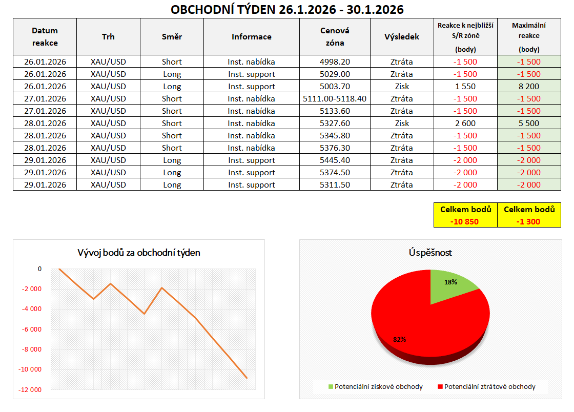 Rovněž zaznamenáváme reakce na trhu se zlatem (XAU/USD). Na tomto trhu bylo minulý týden celkem 11 obchodních příležitosti, z nichž 2 byly úspěšné. To představuje úspěšnost 18 %. Celkově skončil minulý týden ztrátou -10 850 bodů. Pokud trh na institucionální objednávku nereagoval, zaznamenali jsme ztrátu 400 - 1500 bodů v závislosti na šířce dané institucionální objednávky a volatilitě.