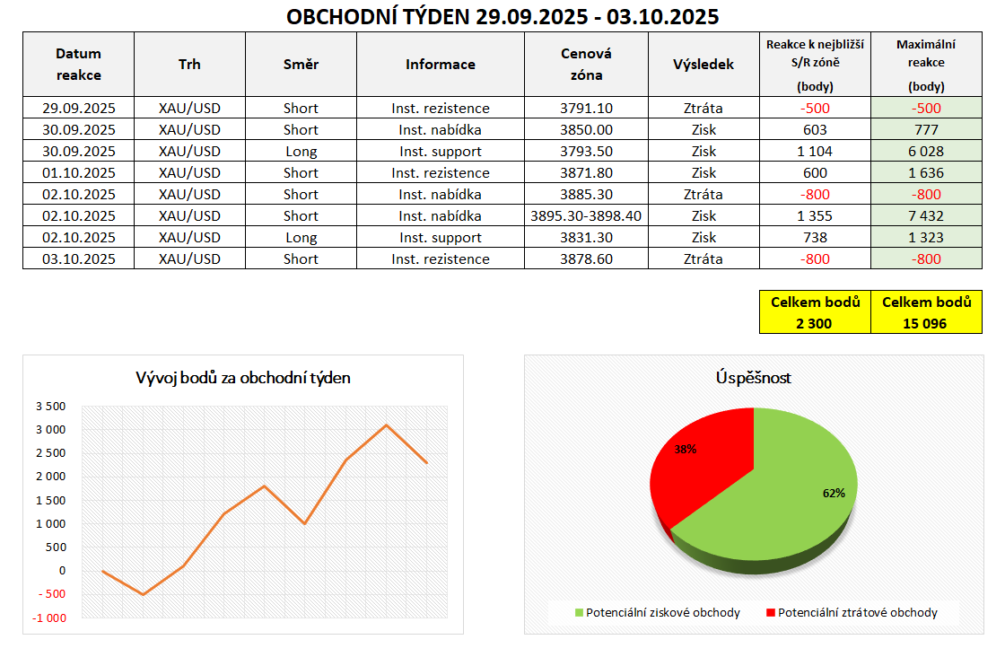 Nově rovněž zaznamenáváme reakce na trhu se zlatem (XAU/USD). Na tomto trhu bylo minulý týden celkem 8 obchodních příležitostí, z nichž 5 bylo úspěšných. To představuje úspěšnost 62 %. Celkově bylo možné za minulý týden potencionálně zachytit reakce ve výši 2300 bodů. Pokud trh na institucionální objednávku nereagoval, zaznamenali jsme ztrátu 400 - 1000 bodů v závislosti na šířce dané institucionální objednávky a volatilitě.
